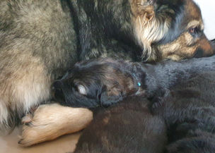 Mustang le papa se fait toujours discret, il ose une visite furtive de temps à autre, quant à Mzlle Shaya il lui tarde de pouvoir mettre sa patte à la tâche. Tous les deux ont pu sentir les bébés avec une bouille toute émerveillée !