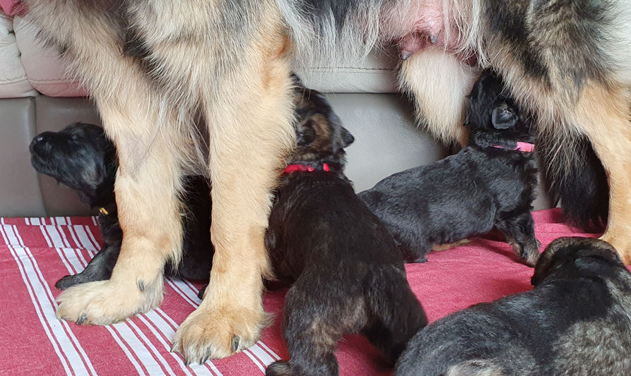 Ils sont de plus en plus dégourdis pour se tenir sur leurs 4 pattes, ils essaient d'attraper les mamelles au passage de maman en se hissant le plus haut possible. Pas facile avec un ventre faisant du lest !